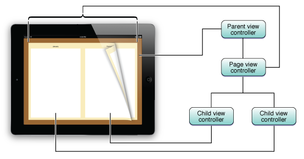 Figure 3-1 shows the page view interface implemented by a sample application. The outermost brown view is associated with the parent view controller, not the page view controller itself. The page view controller has no UI of its own; however, it does add a page curl effect to its children while the user is turning the page. The custom content is provided by the view controllers that are children of the page view controller.