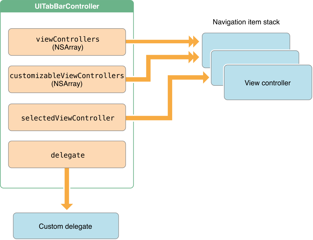 Figure 2-2 shows the relationship of the tab bar controller to its associated view controllers. Each view controller in the tab bar controller’s viewControllers property is a view controller for a corresponding tab in the tab bar.