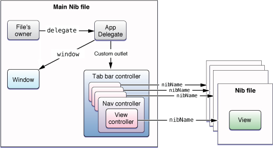 Figure 7-1 shows the configuration of the objects that you need to create in your nib file. In this example, the first three tabs of the tab bar interface use custom view controllers but the last tab uses a navigation controller. One additional view controller is then added to act as the navigation controller’s root view controller. To manage memory better, each of the custom view controllers (including the root view controller of the navigation controller) stores its corresponding view in a different nib file.
