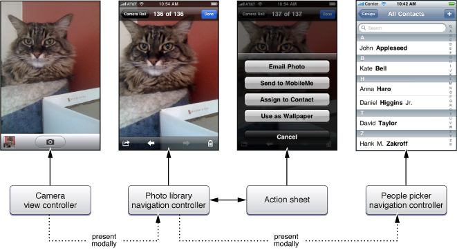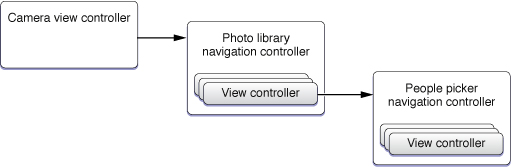 When presenting a navigation controller modally, you always present the UINavigationController object itself, rather than presenting any of the view controllers on its navigation stack. However, individual view controllers on the navigation stack may themselves present other view controllers modally, including other navigation controllers. Figure 6-3 shows more detail of the objects that would be involved in the preceding example. As you can see, the people picker is not presented by the photo library navigation controller but by one of the custom view controllers on its navigation stack.