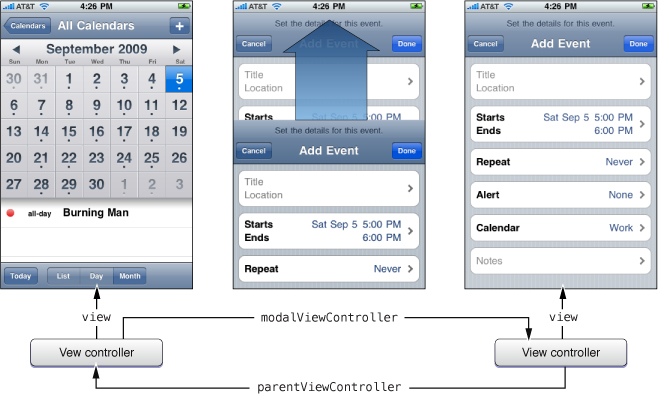 When you present a modal view controller, the system creates a parent-child relationship between the view controller that did the presenting and the view controller that was presented. Specifically, the view controller that did the presenting updates its modalViewController property to point to its presented (child) view controller. Similarly, the presented view controller updates its parentViewController property to point back to the view controller that presented it. Figure 6-1 shows the relationship between the view controller managing the main screen in the Calendar application and the modal view controller used to create new events.