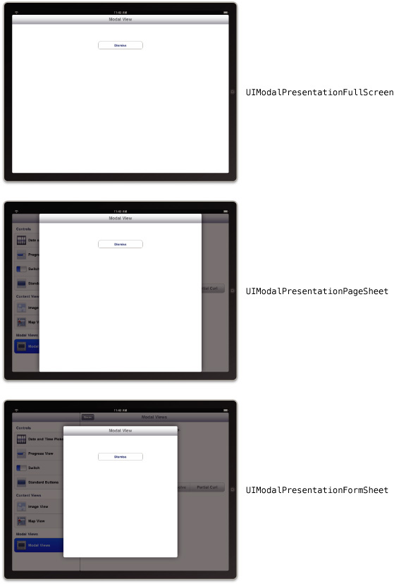 For iPad applications, you can present content modally using several different styles. In iPhone applications, modally presented views always cover the visible portion of the window, but when running on an iPad, view controllers use the value in their modalPresentationStyle property to determine their appearance when presented modally. Different options for this property allow you to present the view controller so that it fills all or only part of the screen.