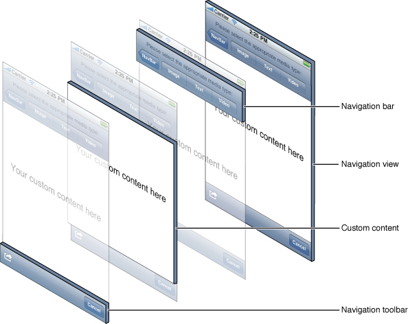 Although the navigation bar and toolbar are customizable views, you must never modify the views in the navigation hierarchy directly. The only way to customize these views is through specific interfaces of the UINavigationController and UIViewController classes. For information on how to customize the contents of the navigation bar, see Customizing the Navigation Bar Appearance. For information about how to display and configure custom toolbar items in a navigation interface, see Displaying a Navigation Toolbar.