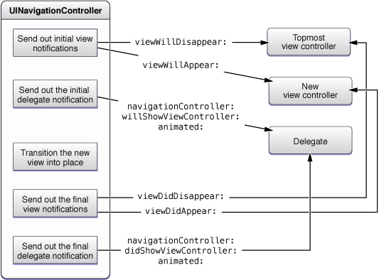 You can use the methods of the navigation controller’s delegate to update the state of your navigation interface and modify your application’s data model. For example, if you are using a navigation interface to facilitate the editing of content, you might use the navigationController:willShowViewController:animated: method to save any changes before the corresponding view controller is dismissed. However, you would not use these methods to make changes to your views or view hierarchy. Those types of changes should be handled by your custom view controllers.