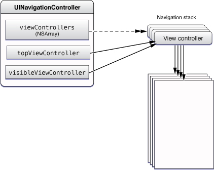 Figure 3-3 shows the relevant relationships between the navigation controller and the objects on the navigation stack. It is important to note that the objects in the topViewController and visibleViewController properties need not be the same. If you present a view controller modally from the topmost object in the stack, the topViewController property does not change but the object in the visibleViewController property does. Specifically, the value in the visibleViewController property changes to reflect the modal view controller that was presented.