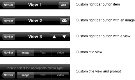 Figure 3-10 shows some different navigation bar configurations, including several that use custom views and prompts. The navigation bars in this figure are from the sample project NavBar: Customizing UINavigationBar's appearance.