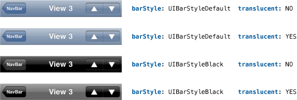 Figure 3-9 shows how the barStyle and translucent properties affect the appearance of the navigation bar. For translucent styles, it is worth noting that if the main view of the underlying view controller is a scroll view, the navigation bar automatically adjusts the content inset value to allow content to scroll out from under the navigation bar. It does not make this adjustment for other types of views.