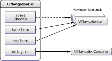 Figure 3-7 shows some of the key objects related to a navigation bar at runtime. The owner of the navigation bar (whether it is a navigation controller or your custom code) is responsible for pushing items onto the stack and popping them off as needed. In order to provide proper navigation, the navigation bar maintains pointers to select objects in the stack. Although most of the navigation bar’s content is obtained from the topmost navigation item, a pointer to the back item is maintained so that a back button (with the title of the preceding item) can be created.