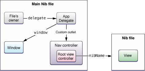 Figure 3-5 shows the configuration of the main nib file for an application that displays a navigation interface in its main window. The nib file includes the window object, the navigation controller, and the root view controller for the navigation interface, which is embedded inside the navigation controller itself. (The view managed by the root view controller typically would not need to be in the same nib file, and in this example is shown in a separate nib file.)