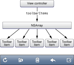 Figure 3-11 shows an example of how the objects you associate with your custom view controller are reflected in the toolbar. Items are displayed in the toolbar in the same order they are provided in the array. The array can include all types of bar button items, including fixed and flexible space items, system button items, or any custom button items you provide. In this example, the five items are all button items from the Mail application.