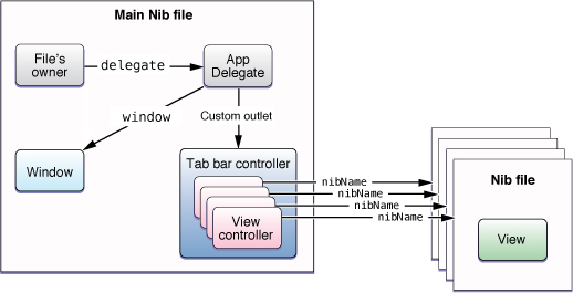 Figure 4-5 shows the typical configuration of a tab bar controller and its related objects in an application’s main nib file. Each custom view controller represents the root view controller associated with a single tab. Because they are all custom view controllers (and not navigation controllers), each view controller has a reference to a separate nib file containing its view. Although you could include the custom views in the main nib file, doing so is not recommended. Storing the views in separate nib files gives the system the option of purging them from memory as needed.