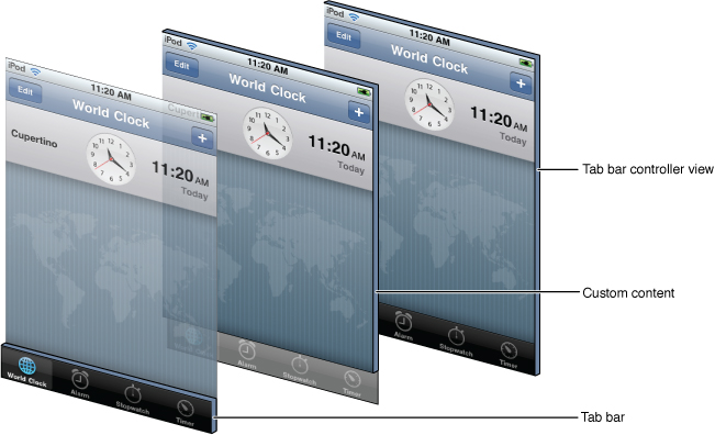 Figure 4-1 shows the tab bar interface implemented by the Clock application. The tab bar controller has its own container view, which encompasses all of the other views, including the tab bar view. The custom content is provided by the root view controller of the selected tab.