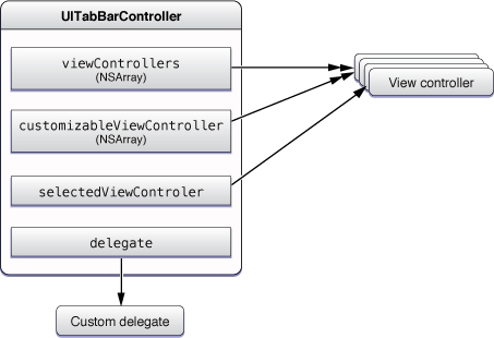 Figure 4-2 shows the relationship of the tab bar controller to its associated view controllers. Each view controller in the tab bar controller’s viewControllers property is a root view controller for a corresponding tab in the tab bar.