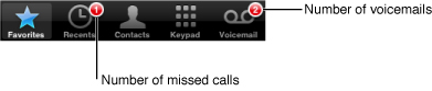 A badge is a small red marker displayed in the corner of the tab. Inside the badge is some custom text that you provide. Typically, badges contain numerical values reflecting the number of new items available on the tab, but you can also specify very short character strings too. Figure 4-7 shows badges for tabs in the Phone application.