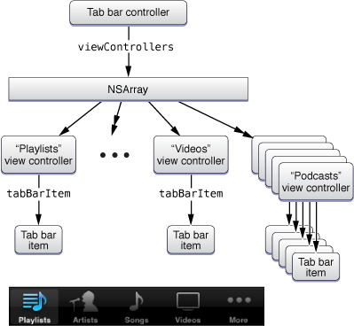 Although the tab bar view is a key part of your tab bar interface, you do not modify that view directly. The tab bar controller object assembles the contents of the tab bar from the UITabBarItem objects provided by your custom view controllers. Figure 4-3 shows the relationship between the tab bar controller, view controllers, and the tab bar item objects in the iPod application. Because there are more view controllers than can be displayed at once, tab bar items from only the first four view controllers are displayed. The final tab bar item is provided by the More view controller.