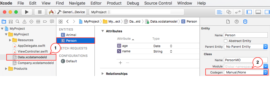 Manual/Nonein the Data Model inspector as shown in Figure 1. Repeat this step for all entities you want to create Core Data managed object subclasses.