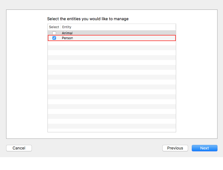 In the sheet that appears, select the entities whose Core Data managed object subclasses you want to create, and click Next.