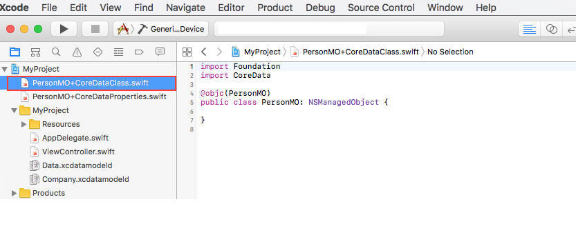 Xcode creates and saves files named ClassName+CoreDataClass and ClassName+CoreDataProperties for each of your selected entity in the selected location where ClassName is the name of your entity's NSManagedObject subclass. ClassName+CoreDataClass implements the NSManagedObject subclass as shown in Figure 6.